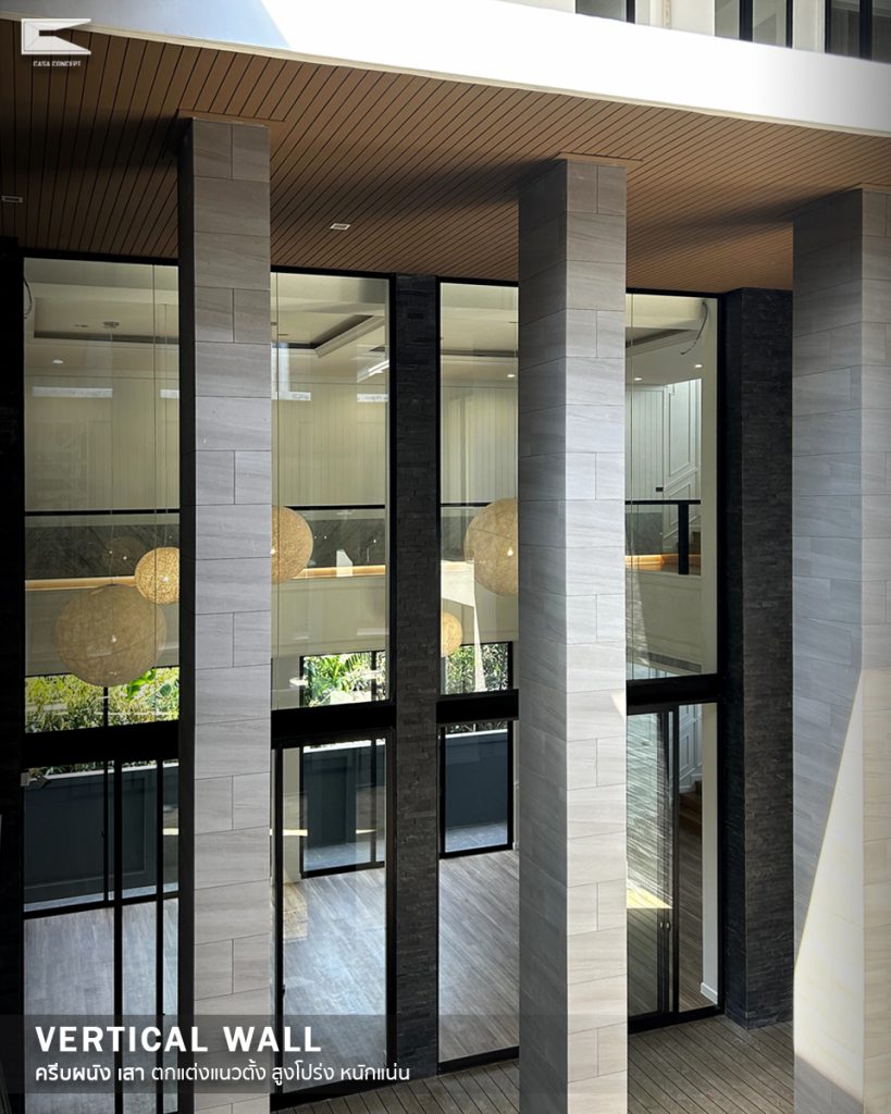 ครีบผนัง หรือ เสา ตกแต่งภายนอก เป็นดีไซน์ที่ดึงดูดหรือเป็นจุดเด่นให้อาคารน่าสนใจและสามารถรับน้ำหนักอาคารไปด้วยได้ ความสูงชะลูดของครีบผนังหรือเสาที่สูงโปร่งจากชั้นล่างไปจนถึงฝ้าเพดานชั้นบน สามารถส่งผลทางความรู้สึกด้านการรับรู้พื้นที่เป็นอย่างมาก ด้วยการดีไซน์เส้นแนวตั้ง หรือ เส้นแนวดิ่ง ที่ให้ความรู้สึกถึงความสูงสง่า มั่นคง แข็งแรง หนักแน่น จึงเป็นองค์ประกอบหนึ่งในการดีไซน์บ้านหรู เพื่อส่งเสริมความอลังการของบ้านมากยิ่งขึ้น
