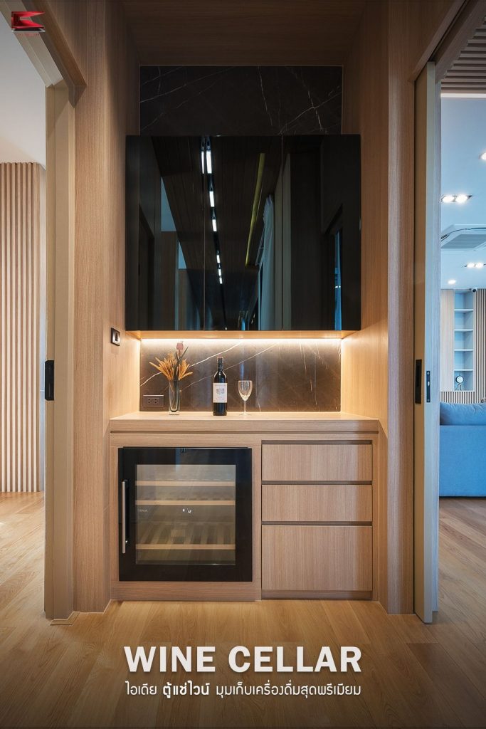 ตู้แช่ไวน์ หรือ ห้องเก็บไวน์ เป็นอีกหนึ่งฟังก์ชั่นที่หลายคนเริ่มสนใจในการสร้างไว้ที่บ้าน เนื่องจากไวน์เป็นเครื่องดื่มที่มีมูลค่าสูง สอดคล้องกับไลฟ์สไตล์ของผู้อยู่อาศัยสำหรับบ้าน Luxury ที่มักมีการสังสรรค์ด้วยอาหารและเครื่องดื่มสุดพรีเมียม หรือมีไวน์เป็นของสะสม ดังนั้นการมีมุมที่สามารถโชว์หรือแช่ไวน์เพื่อเก็บรักษาไว้ในอุณหภูมิที่เหมาะสม คงคุณภาพไม่ให้รสชาติเปลี่ยนแปลงไป และสะดวกต่อการนำออกมาดื่มจึงเป็นส่วนที่จำเป็นในองค์ประกอบของบ้านหรู ปัจจุบันสามารถดีไซน์มุมหรือห้องเก็บไวน์ให้สวยงามเข้ากับสไตล์การตกแต่งบ้านได้ หรือเป็นตู้ Built-in ที่สามารถใช้ประโยชน์ได้หลายประเภทในคราวเดียว